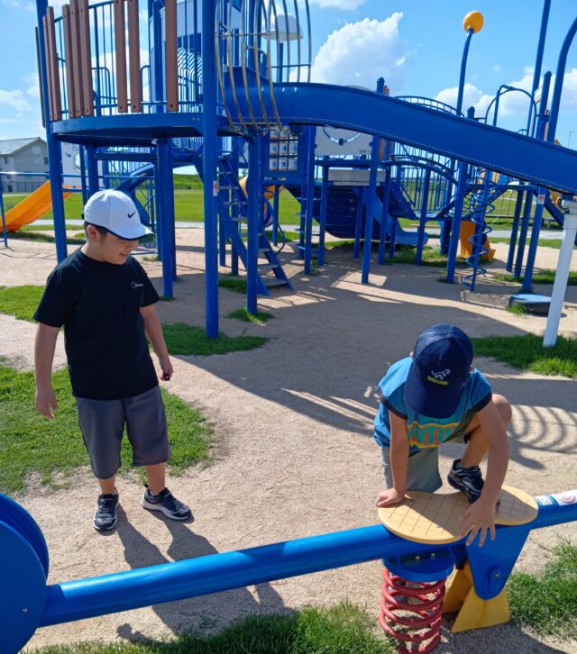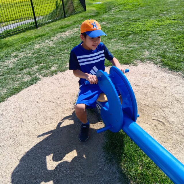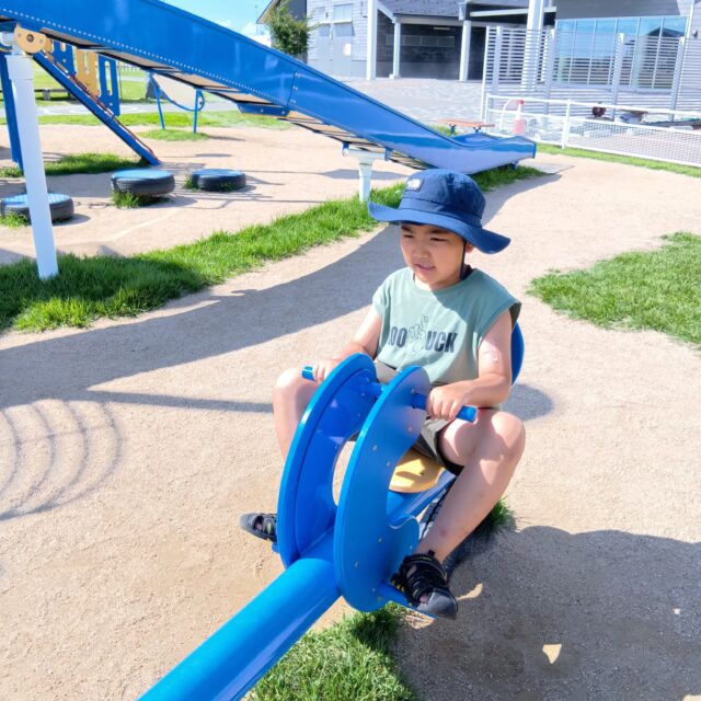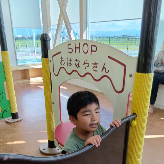 広い施設内には室内遊具があり、外にも大型遊具が設置されていて、芝生の広場も完備されていました。